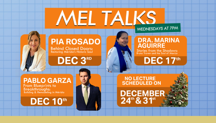 December 3: Behind Closed Doors: Restoring Mérida’s Historic Soul - What stories live behind the grand old doors of Mérida’s Centro? Join us for a special MEL Talk with Pia Rosado, landscape architect, designer, and co-author of Mérida a Puertas Abiertas / Behind Closed Doors, a stunning bilingual book that explores 18 beautifully restored homes in Mérida’s historic center. Told through personal anecdotes and intimate design journeys, the book — and this talk — reveal how abandoned ruins have been brought back to life, and how Centro has become a magnet for transformation. Pia will sign copies of her book after the talk, and you can secure your copy in advance online in the MEL Shop. Pia will make a generous donation to MEL for each copy sold.