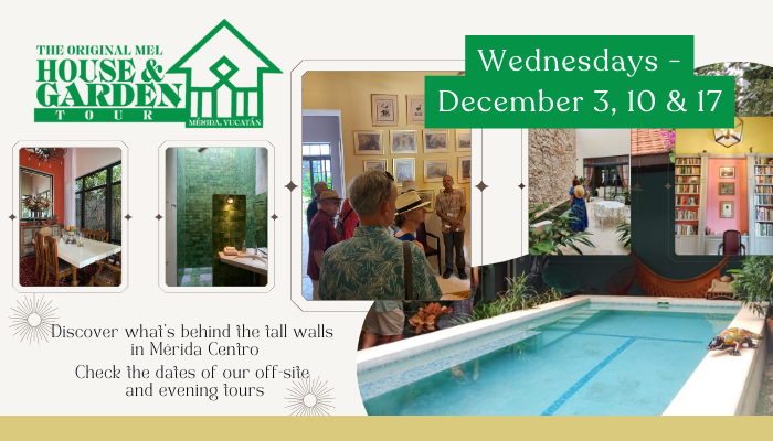 This December, we invite you to explore the charm and beauty of Mérida with our House & Garden Tours, happening every Wednesday morning—except for December 24 and December 31. We are especially excited for Wednesday December 10, which features a neighborhood tour of the Santa Ana neighborhood in the morning (meeting at 9:30 AM near the fountain in Santa Ana Park Calle 60 x Calle 43), and later we will host the season's first Evening Tour. Experience the magic of Mérida’s homes under the glow of night lights! We’ll meet outside the Museo Regional de Antropología (Paseo de Montejo x Calle 43) at 5:30 PM to begin this unforgettable journey.