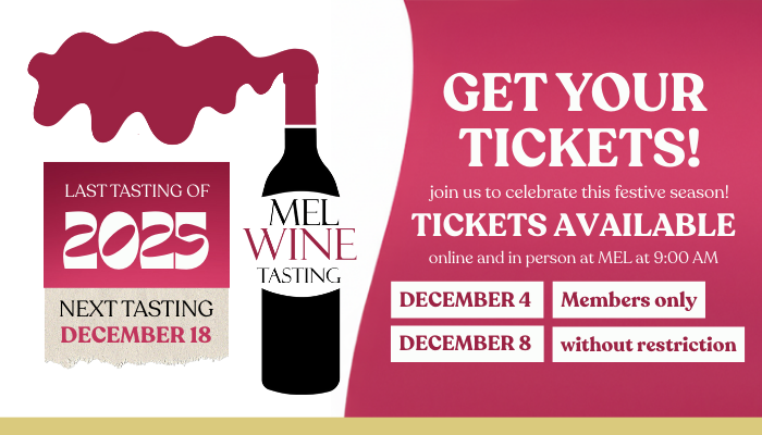 There are still Season Tickets available for the remaining four wine events! We encourage supporters of MEL and those who want to enjoy a fun evening with art, music, good wine and tasty tapas to buy a Season Ticket for $2,800. This will guarantee your spot at the remaining four events, including the exciting December 18th event. These Season Tickets are only available to MEL members, so join today if you are not already a member!