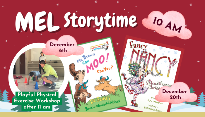 Join us on Saturday, December 6th at 10 am to read Mr. Brown Can Moo! Can You? by Dr. Seuss to explore the sound animals make. Stay over, right after Storytime to have fun at the Playful Physical Exercise Workshop, a fun 60-minute session for kids ages 5–10, guided by a specialized physiotherapist from Sensoria Rehab Center. Through games, animal walks, balance challenges, and creative movement, little ones will build strength, coordination, confidence, and emotional expression—all while having fun! This is a free class, wear comfortable clothes and shoes.