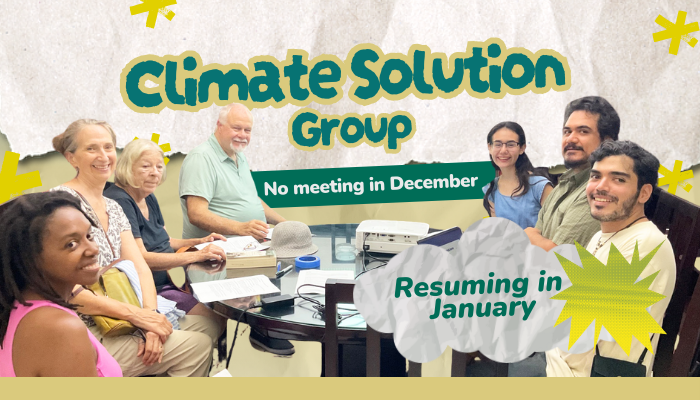 The Climate Solutions Group will not meet at MEL in December. We’ll see you at our next meeting on Saturday January 17 starting at 11:30 AM.