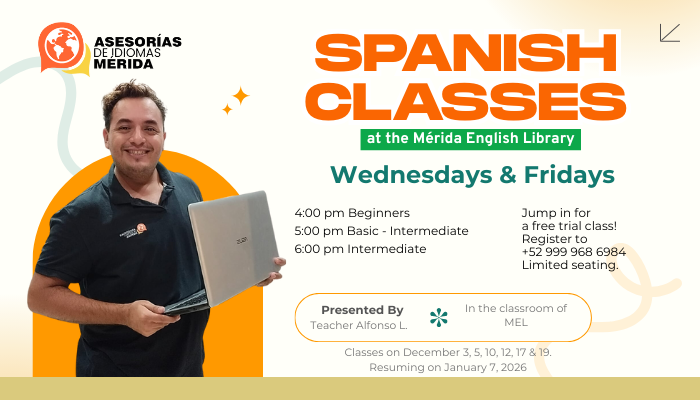 We meet in the air-conditioned classroom of the Mérida English Library. Register now online or in person and live the experience with teacher Alfonso, language instructor. Learn more about our classes here.