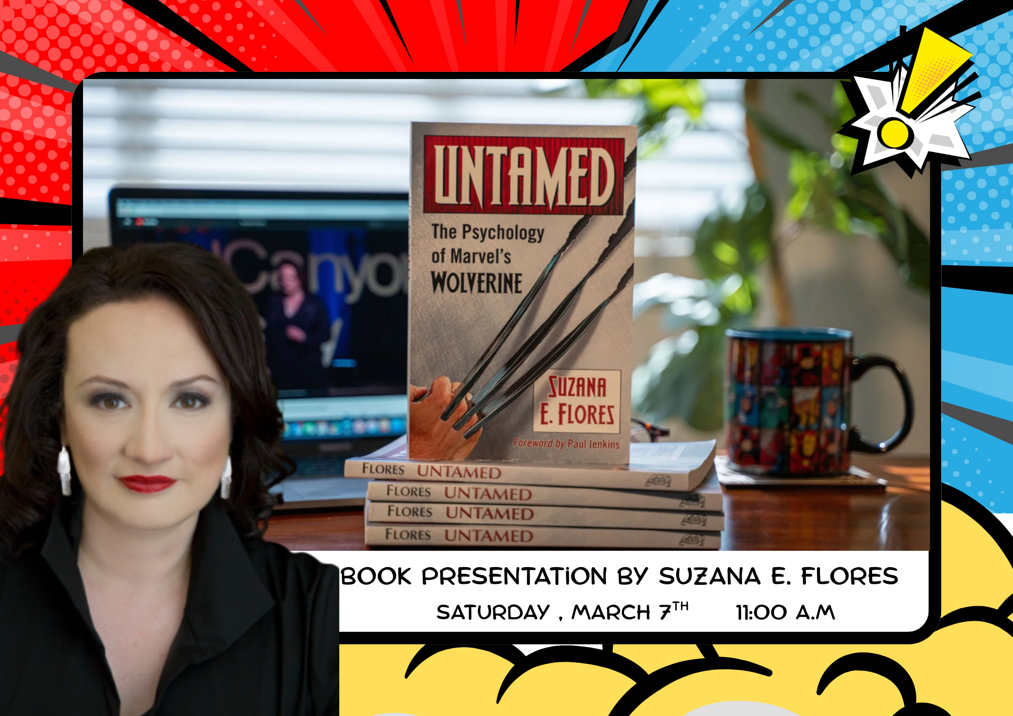 Untamed: The Psychology of Marvel's Wolverine — Dra. Suzana Flores presents her book on Saturday March 7 at 11:00 AM. Marvel Comic's savage, brooding antihero is, in his own words, the best at what he does--killing with gratuitous precision. Paradoxically violent yet humane, the beer-swilling, cigar-smoking mutant with retractable claws is universally misjudged in the Marvel Universe yet esteemed by fans worldwide. Dra Flores explores Wolverine's development from bit character to modern legend over more than four decades, with a focus on his enduring appeal as an allegory for resilience through torment. Read more about her work on her website.