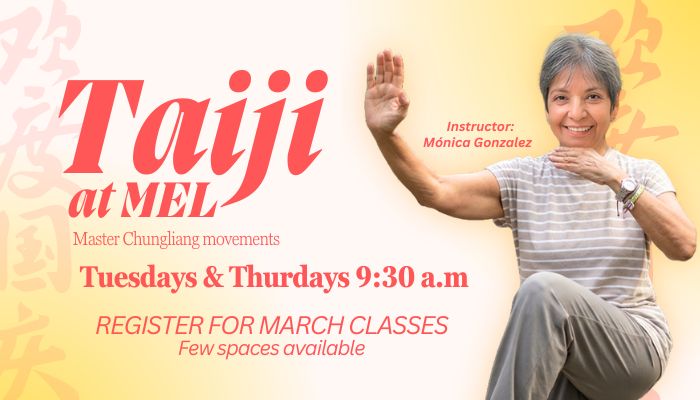 Join Mónica González starting on March 5 to explore Master Chungliang movements, Tuesdays and Thursdays at 9:30 – 10:30 AM. Classes are $100 per session with discounts for purchases of six sessions or more. Visit the MEL Shop to reserve your spots. NOTE: THERE WILL BE NO TAI CHI ON MAUNDY THURSDAY, APRIL 2.