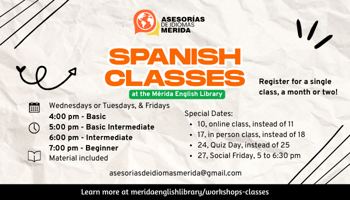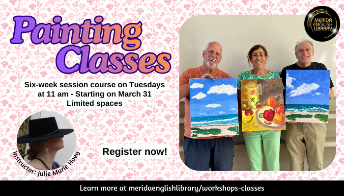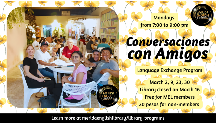 The Mérida Writers Group meets in our classroom every-other-week, including March 11 and March 25. This is an opportunity for writers of all levels and genres to share their work. Join them starting at 11:00 AM.