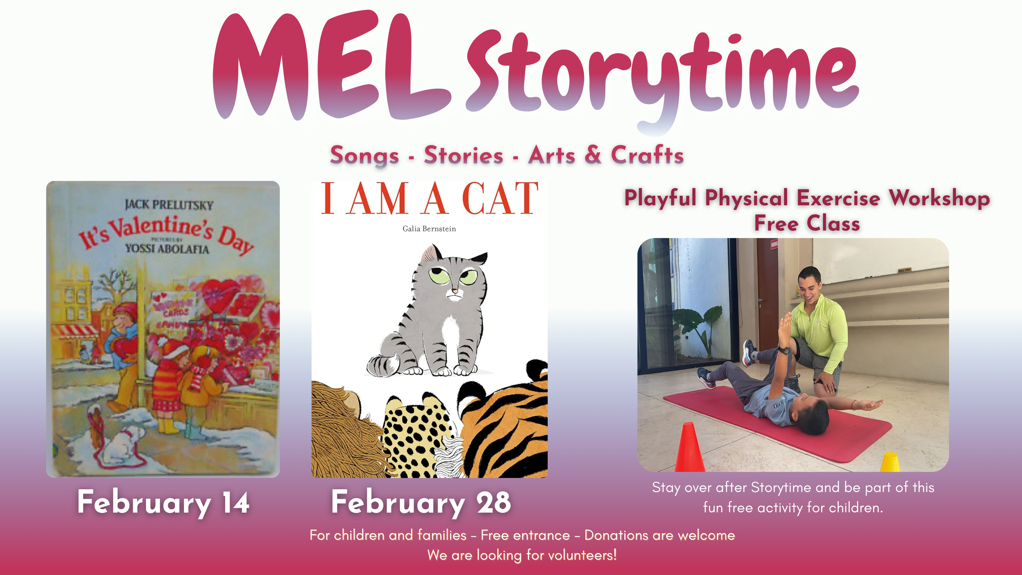 Children’s Storytime in February is full of love, imagination, and fun! This month, our young readers will enjoy It’s Valentine’s Day on February 14, followed by a Valentine’s card-making activity, and I Am a Cat on February 28, when children will delight in a playful cat puppet activity. After each reading, our friends from Sensoria will lead physical activities and dynamic games designed especially for children. Children’s Storytime is open to all kids and is completely free — families are warmly invited to join us and celebrate reading, movement, and creativity together.