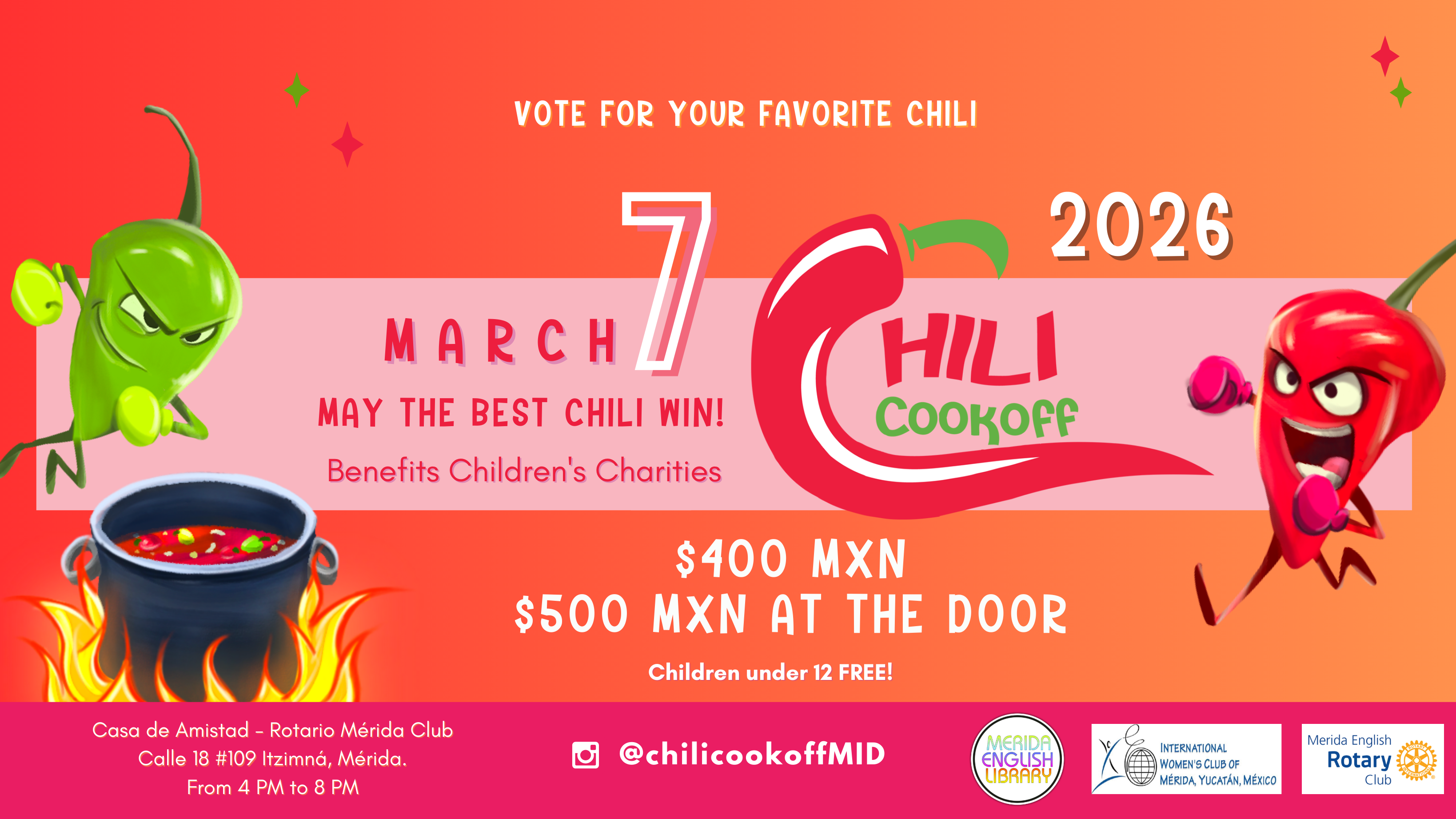 The Mérida Chili Cook-Off returns on March 7, 2026, from 4:00 to 8:00 PM for an afternoon of bold flavors, friendly competition, and great vibes. Sample homemade chilis, enjoy food, music, drinks, and community fun at Casa de Amistad in Itzimná—all while supporting a good cause.