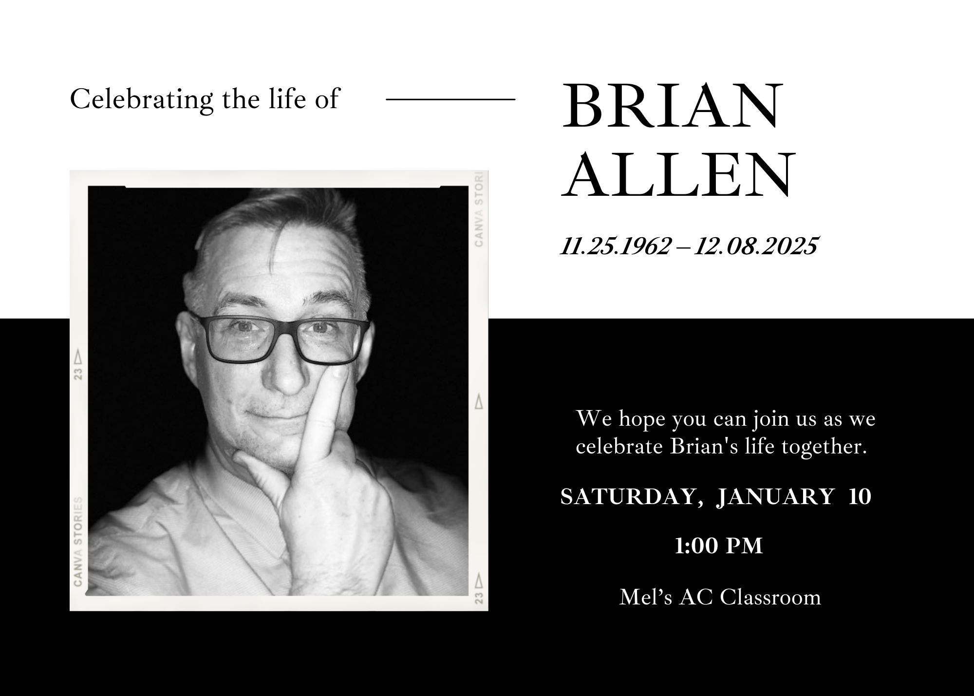 We would like to share that on Saturday, January 10 at 1:00 p.m., we will hold a Celebration of Life in honor of Brian Allen, a beloved MEL volunteer who passed away on December 8.