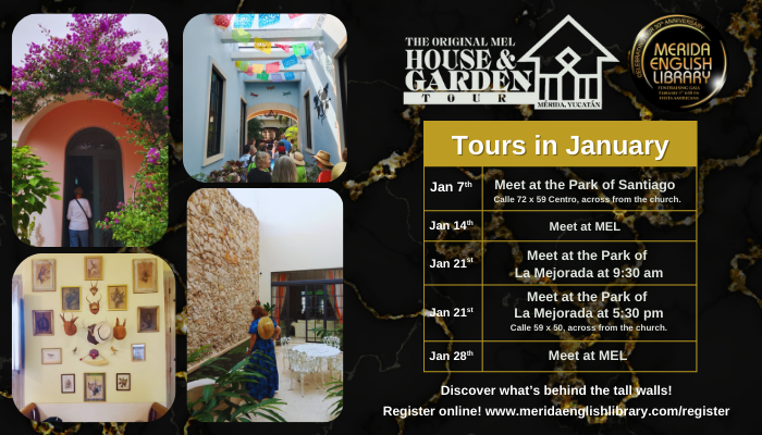 We invite you to explore the charm and beauty of Mérida with our House & Garden Tours, happening every Wednesday morning. The first tour of the new year will be a special Neighborhood Tour, as we’ll gather at 9:30 AM in Santiago Park (Calle 59 x Calle 72) on January 7 for a tour of nearby homes. Then, Wednesday January 21 includes two tours - a neighborhood tour of the Mejorada neighborhood in the morning (meeting at 9:30 AM in Mejorada Park Calle 50 x Calle 59), and later we will host the new year's first Evening Tour. Experience the magic of Mérida’s homes under the glow of night lights! We’ll meet again at Meojarda Park at 5:30 PM to begin this unforgettable journey.