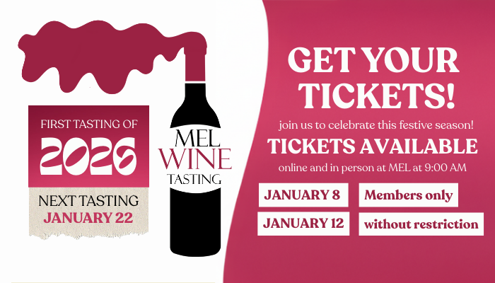 There are still Season Tickets available for the remaining three wine events! We encourage supporters of MEL and those who want to enjoy a fun evening with art, music, good wine and tasty tapas to buy a Season Ticket for $2,100. This will guarantee your spot at the remaining three events, including the exciting January 15th event. These Season Tickets are only available to MEL members, so join today if you are not already a member!