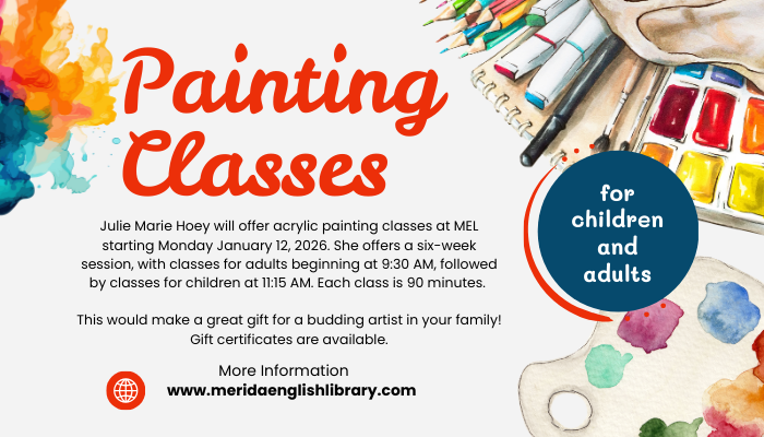 Remember, you can always call the library at 999-924-8401 or email us at info@meridaenglishlibrary.com for more information. Be sure to visit our website, Facebook page, or Instagram profile to stay updated on weekly, monthly, and upcoming events. And never forget — libraries change lives by offering communities a place to learn, create, and belong.