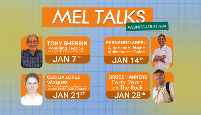January 7: Vanishing Legacy: Roads, Rails & Ruins of Yucatán — What do Maya ceremonial highways, colonial-era railways, and abandoned haciendas all have in common? They’re more than just ruins — they’re the fading footprints of power, belief, and transformation across centuries of Yucatán history. Join us for a visually rich and thought-provoking MEL Talk with Tony Sherrin, long-time Mérida resident, classical scholar, and passionate explorer of Maya and colonial heritage. In this engaging presentation, Tony will guide us through three powerful legacies of movement and meaning in Yucatán: