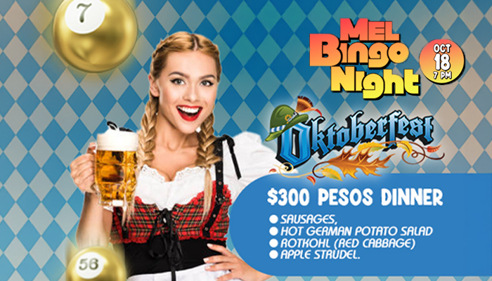 Join us for a special night of Bingo on Saturday October 18 starting at 7:00 PM, as Oktoberfest arrives at MEL. Enjoy all the traditional MEL Bingo Night Activities, plus a special menu provided by members of the International Women’s Club. They’ll serve sausages, hot German potato salad, Rotkohl (German red cabbage) and apple strudel all for $300. Also expect our usual cash bar offerings.