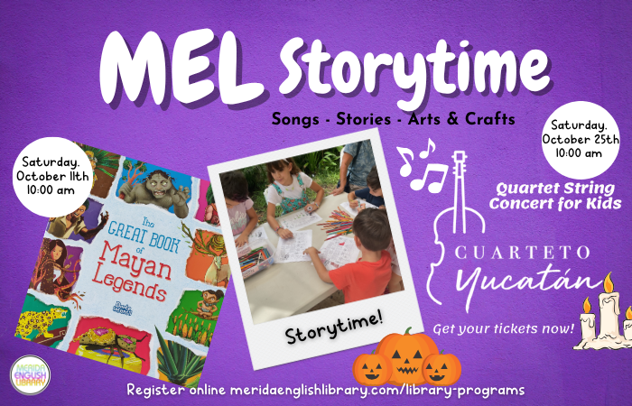 MEL Storytime takes place every other Saturday at the patio of the Mérida English Library at 10:00 am.