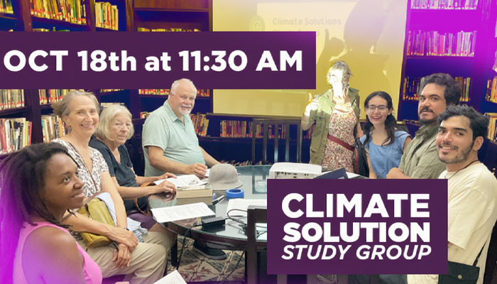 The Climate Solutions Group will meet on Saturday October 18 at 11:30 AM in our classroom. In this group, we learn, grow, and build a community of people concerned about preparing for climate change. These meetings are open to the public – we look forward to seeing you there!