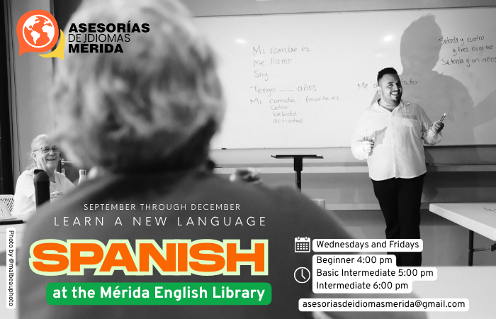 We meet in the air conditioned classroom of the Mérida English Library. Register now online or in person and live the experience with teacher Alfonso, language instructor. Learn more about our classes here.